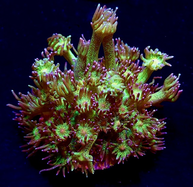This frag has direct lineage to the original piece of this morph which was imported into the UK some 17 years ago and named as “Glitterball Goniopora” by us. One of the UK’s rarest corals, the UK’s original Glitterball Goniopora, now 12th generation and fully UK Grown. A stunning deep purple polyped Gonipora coral frag with amazing neon fluorescent yellow base with metallic glitter flecks that shimmer throughout. This frag has over 20 polyps that will expand to around 50mm once settled and has been cut from our original mother colony as said which we have had for over 17 years so well used to captive conditions.