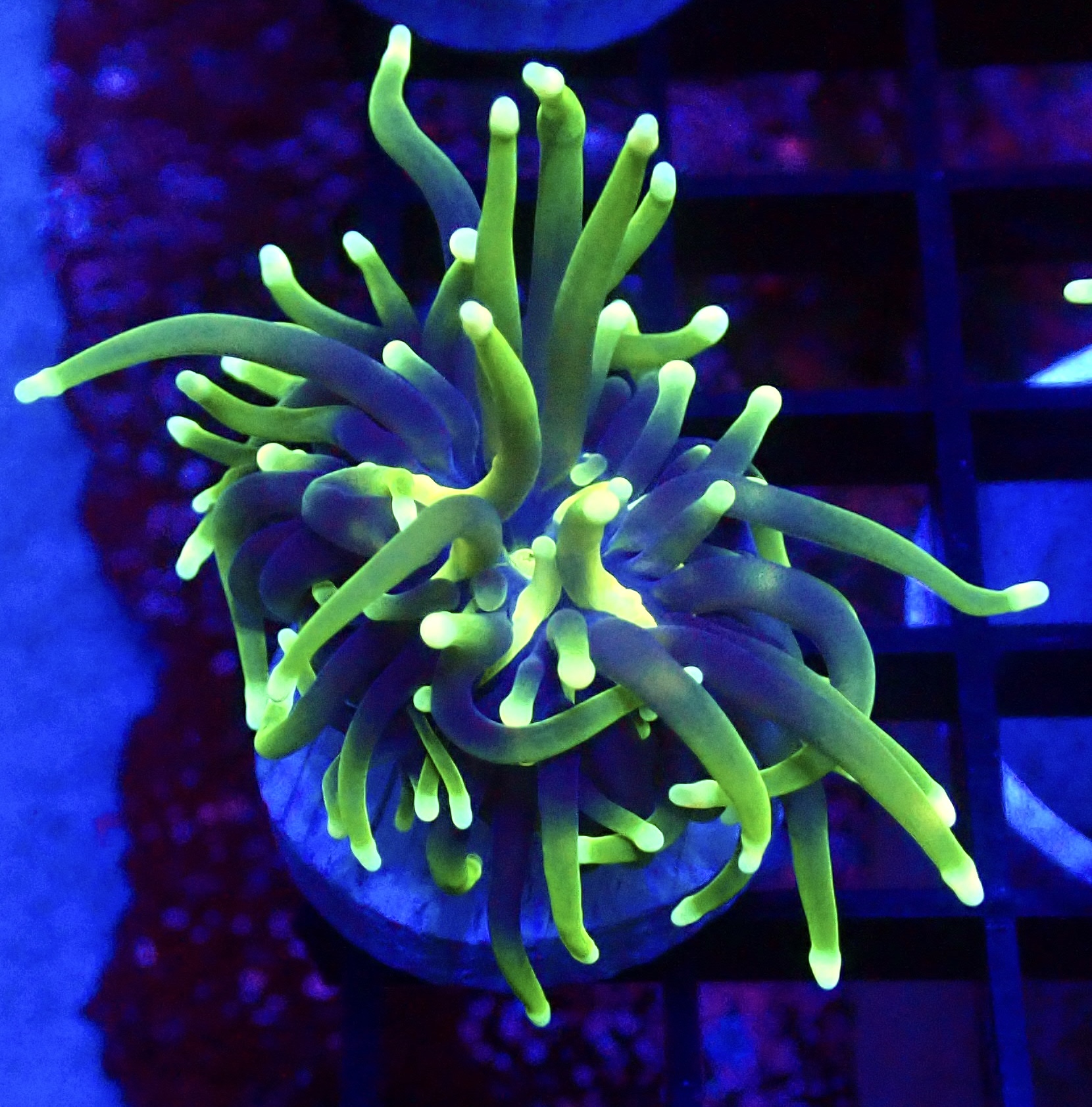 A lovely Torch coral with Purple/ Bright Lime Tentacles and Super Bright Neon Tips