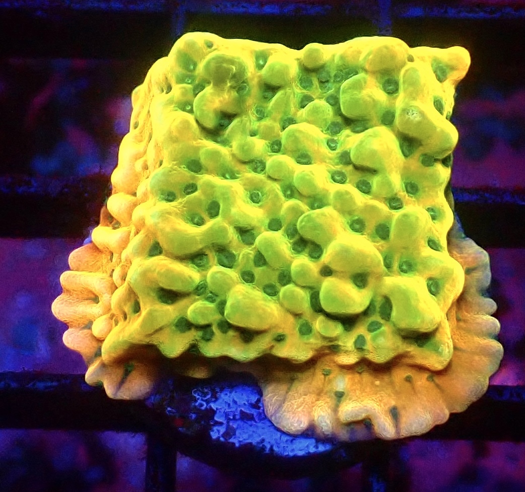A very rare chance to own one of the most beautiful, high end Montiporas there is. These are 6th generation 100% UK grown Frags. These are truly stunning with super bright orange, yellow and green colouration. A reasonably fast grower once settled and one of the brightest corals in our display tank. Good flow and lower to moderate lighting will be appreciated. These frags have been rested well rested are in tip top shape and full colour.