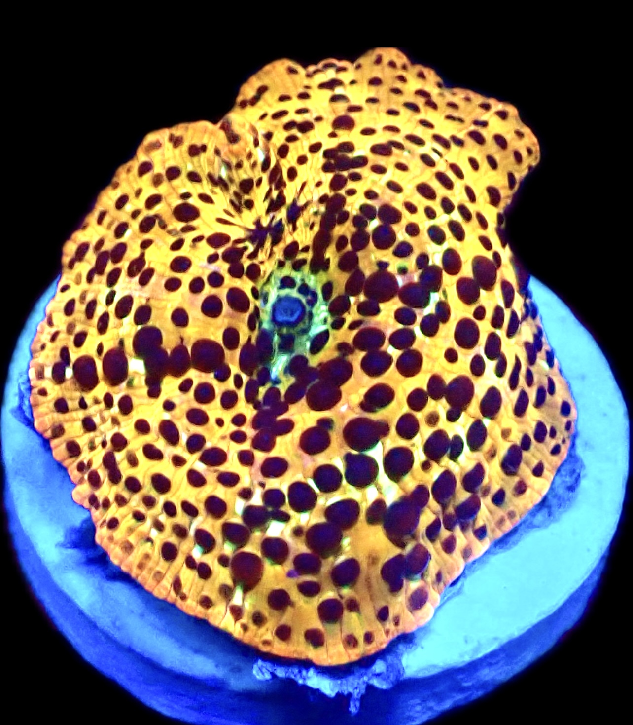 A very popular coral throughout the hobby , a very attractive coral that is fairly undemanding and easy to keep. New mushrooms will develop from this one and they will spread quickly making a stunning display to any reef tank , This mushroom frag come attached to a piece of live rock and on a frag plug, they are a very beautiful Orange colour with spots throughout and a green and blue mouth.