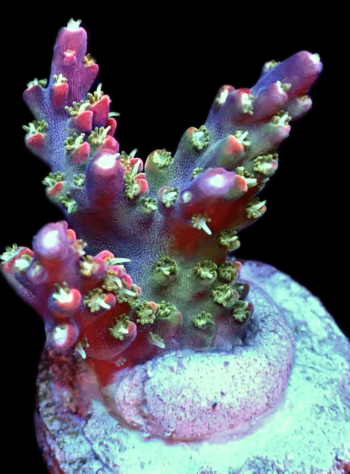 A real show stopper of rainbow staghorn Acropora, frags all cultured from our own mother colonies which we have had here for over 10 years so all frags are well coloured and used to captive conditions not from fresh cut imported pieces. Purple tips with bright polyps, orange coralites and greenish base. This is a quick grower and frags will be well sized at 25-30mm.