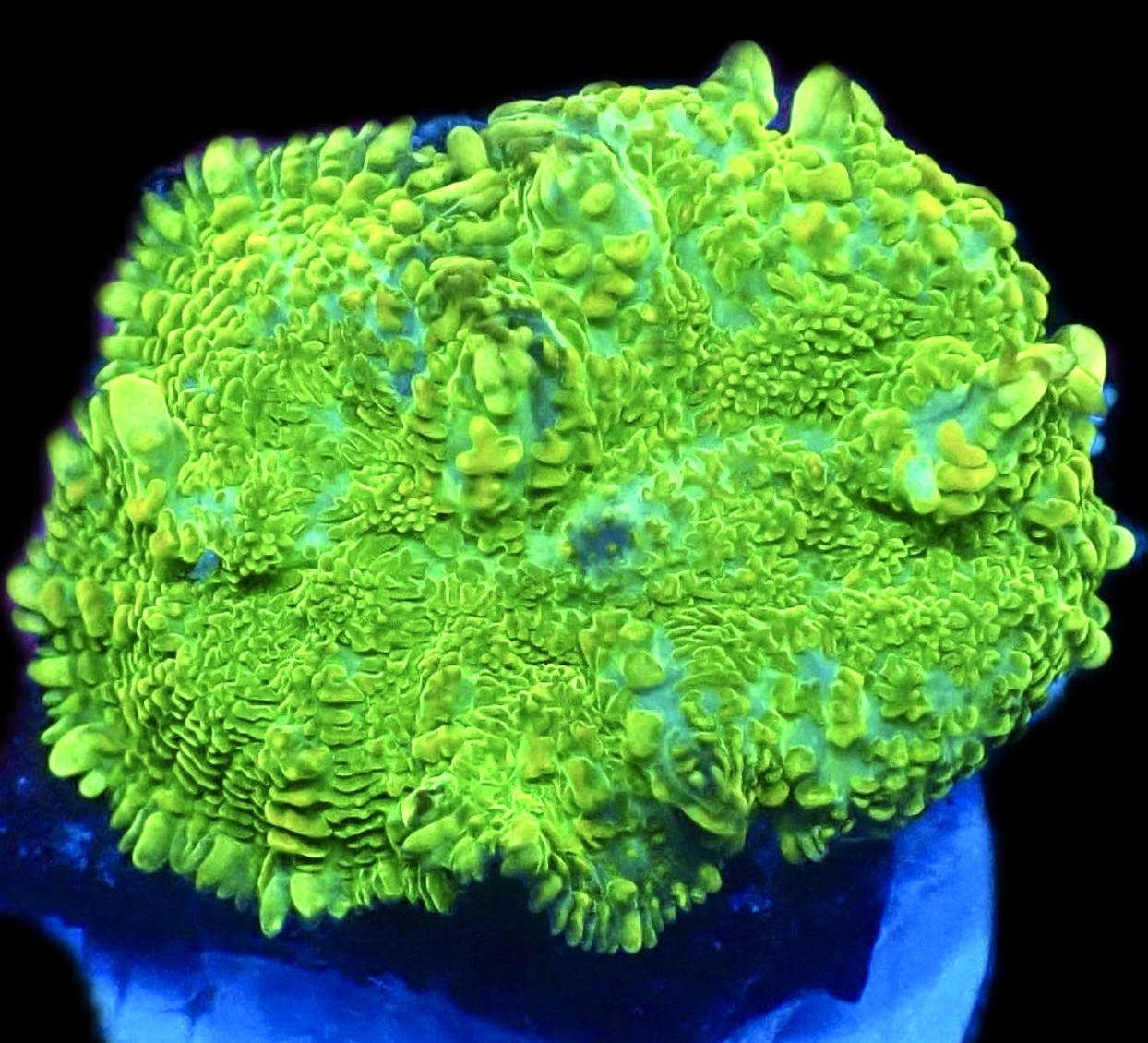 A very popular coral throughout the hobby , a very attractive coral that is fairly undemanding and easy to keep. New mushrooms will develop from this one and they will spread quickly making a stunning display to any reef tank , This mushroom frag coms attached to a frag disc and piece of live rock, they are a very beautiful metallic Lemon/Lime colour.