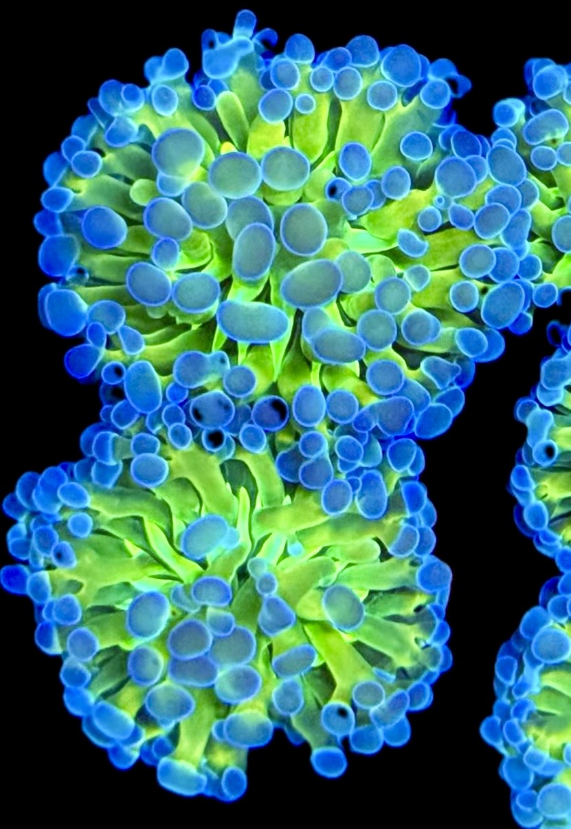 The Frammer Euphyllia is a pretty rare species, it is a hybrid of Hammer and Frogspawn and can happily reside next to either species. This morph has a Neon Green striped base with Neon Green tentacles and Blue tips.