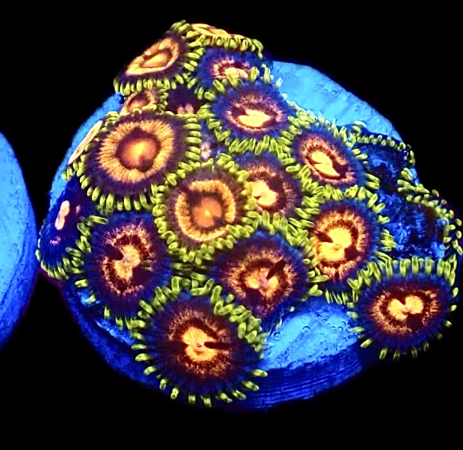 A beautiful coloured zoanthid frag. All frags will have over 12 polyps and will be from the colony pictured. These will spread rapidly and in a carpet like formation over your rockwork giving a beautiful and colourful effect. A great soft coral for the beginner and expert alike. They are very easy to care for and need no special care other than good water parameters.