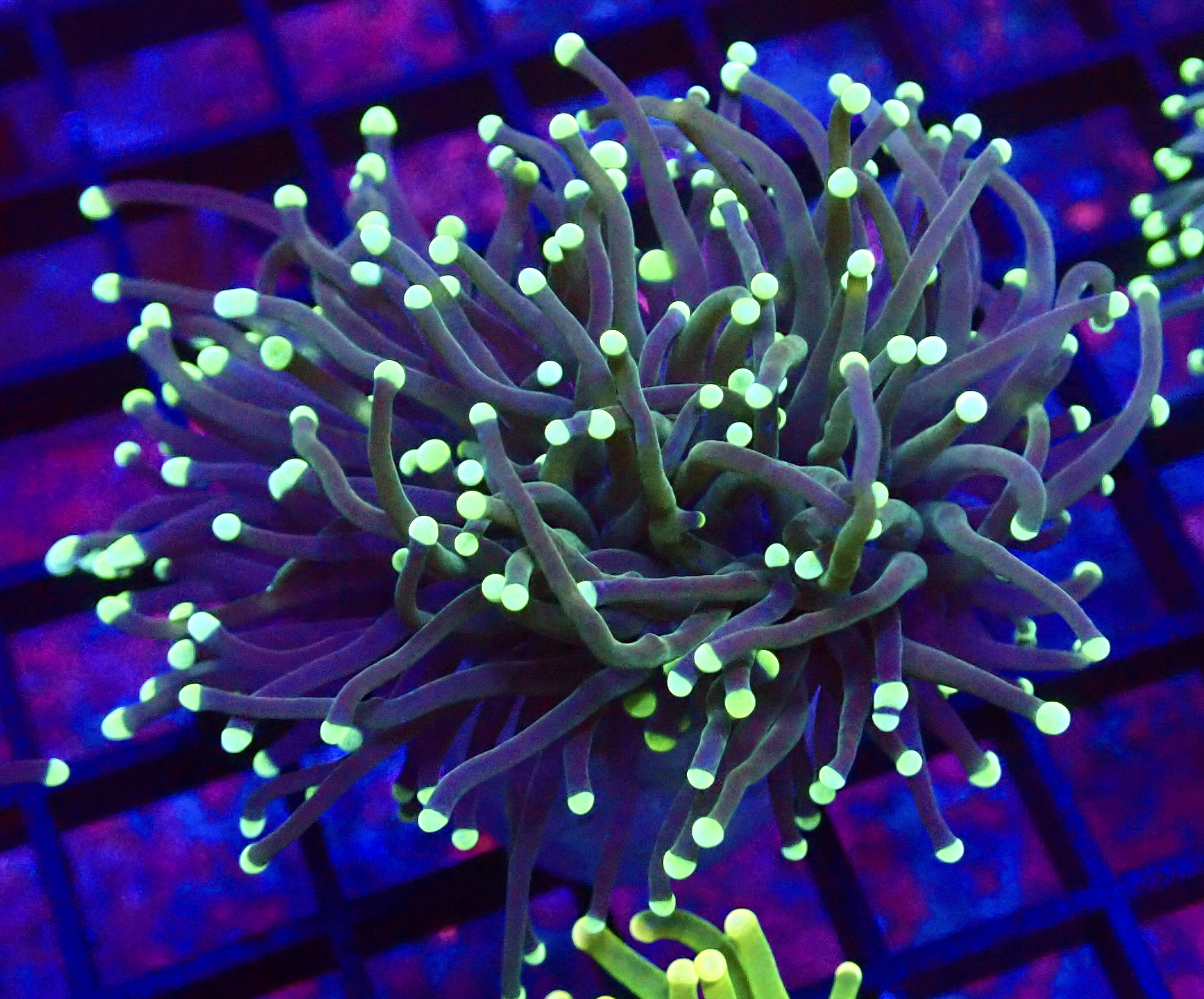 With stunning metallic, fluorescent green tips and dark purple tentacles, this Euphyllia glabrescens torch coral frag will glow in your aquarium. These Torch coral frags will add superb movement as they flow in the current and will spread to around 80mm when expanded. This coral will grow reasonably quickly and is very easy to keep , it will be more than happy under moderate to strong lighting and moderate flow.
