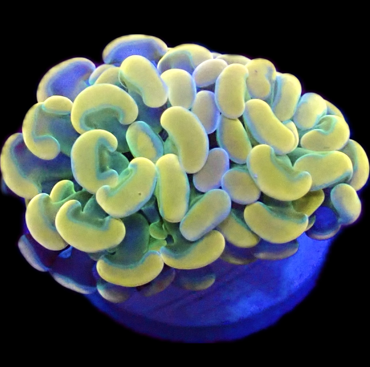 Stunning and very unusual branching hammer coral frags , these are single heads of this much sought after hammer with its blue, green, orange colouration resulting in a wonderful holographic effect as it shimmers under your actinic lighting.