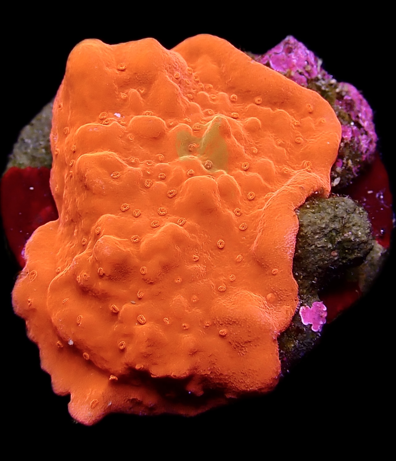 A stunning and rare Montipora with ultra fluorescent orange/red colouration . It will grow in an erattic encrusting formation with irregular branches growing upwards and will cover rockwork. The frag will be approx 25-30 mm and will grow fairly quickly over your rockwork if given good sps conditions. This sps coral is stunning once grown out and settled , we only have a few and this is the first time they have been available from us, this may be the only opportunity you have to own this rare montipora