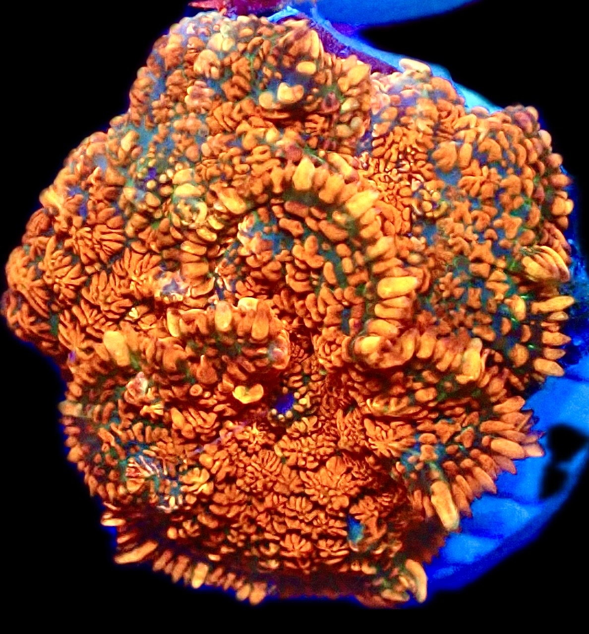 A super bright Orange and Yellow Rhodactis mushroom with a Green base which is simply stunning under blue aquarium lighting.