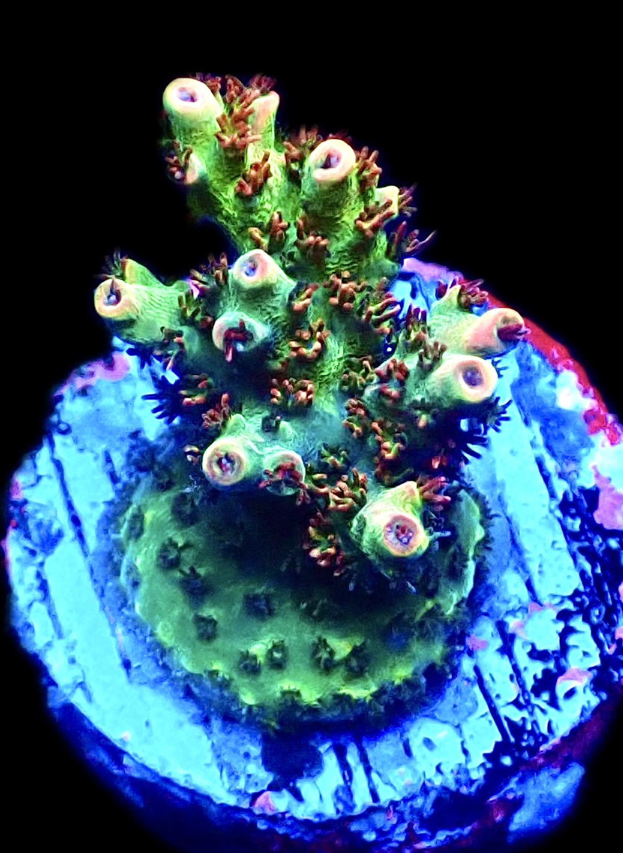 A first chance to own one of these beautiful Acropora , these are a new release that we have been growing out for over a year now from our own mother colony. Truly stunning colouration with vibrant pink , green and blue with red polyps.