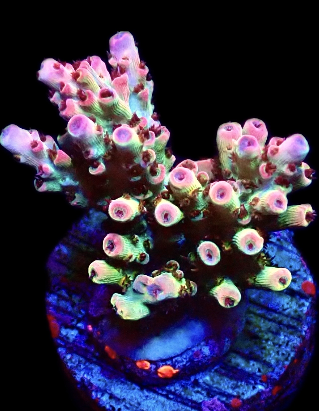 Not often we frag our Mother Colonies of this special Acropora, a real collectors species with Pink, Purple, Orange and Green being the main colours that will develop as it matures. We have also added a picture of one of our Mother Colonies so you can see the full beauty of this species.