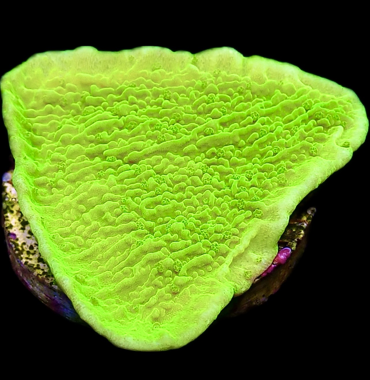 THESE ARE SUPER NEON GREEN MUCH BRIGHTER THAN THE STANDARD GREEN PLATING MONTIPORA