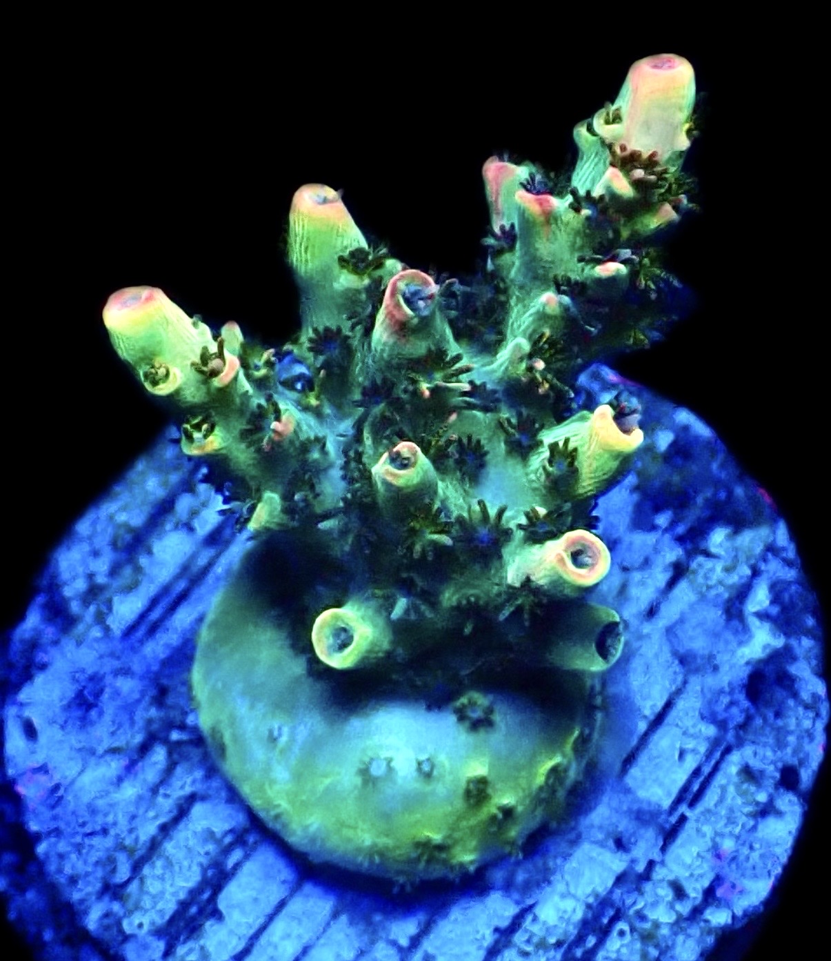A first chance to own one of these beautiful Acropora  , these are a new release that we have been growing out for over a year now from our own mother colony. Truly stunning colouration with vibrant  pink , green and blue with red polyps.