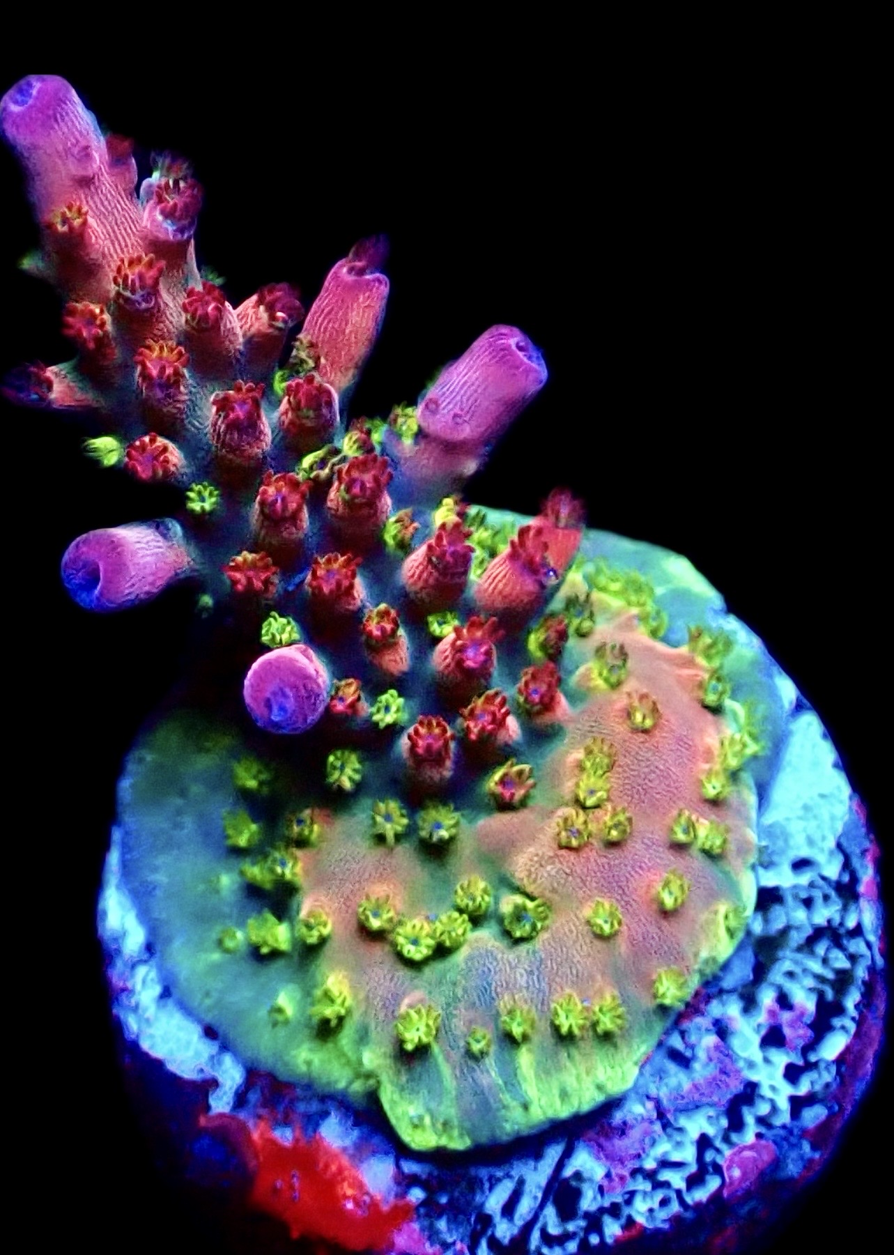 A first chance to own one of these beautiful Acropora , these are a new release that we have been growing out for over a year now from our own mother colony. Truly stunning colouration with vibrant purple, pink , green with blue polyps.