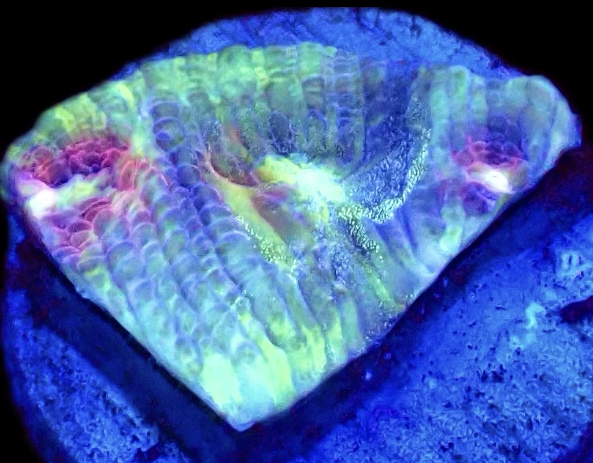 This very unusual frag of this stunning Chalice morph has settled extremely well, coloured up and healed superbly after being cut over 6 weeks ago from our mother colony and fully UK grown. The colours are really coming to the fore with the yellow eyes mixed with purples, reds, pinks and bright fluorescent green. Chalice really are stunning corals and this morph is a must for anyone wanting to add some great colour and patterns. Easy to look after and happy in low to medium par so a great addition to colour up the bottom half of your reef.
