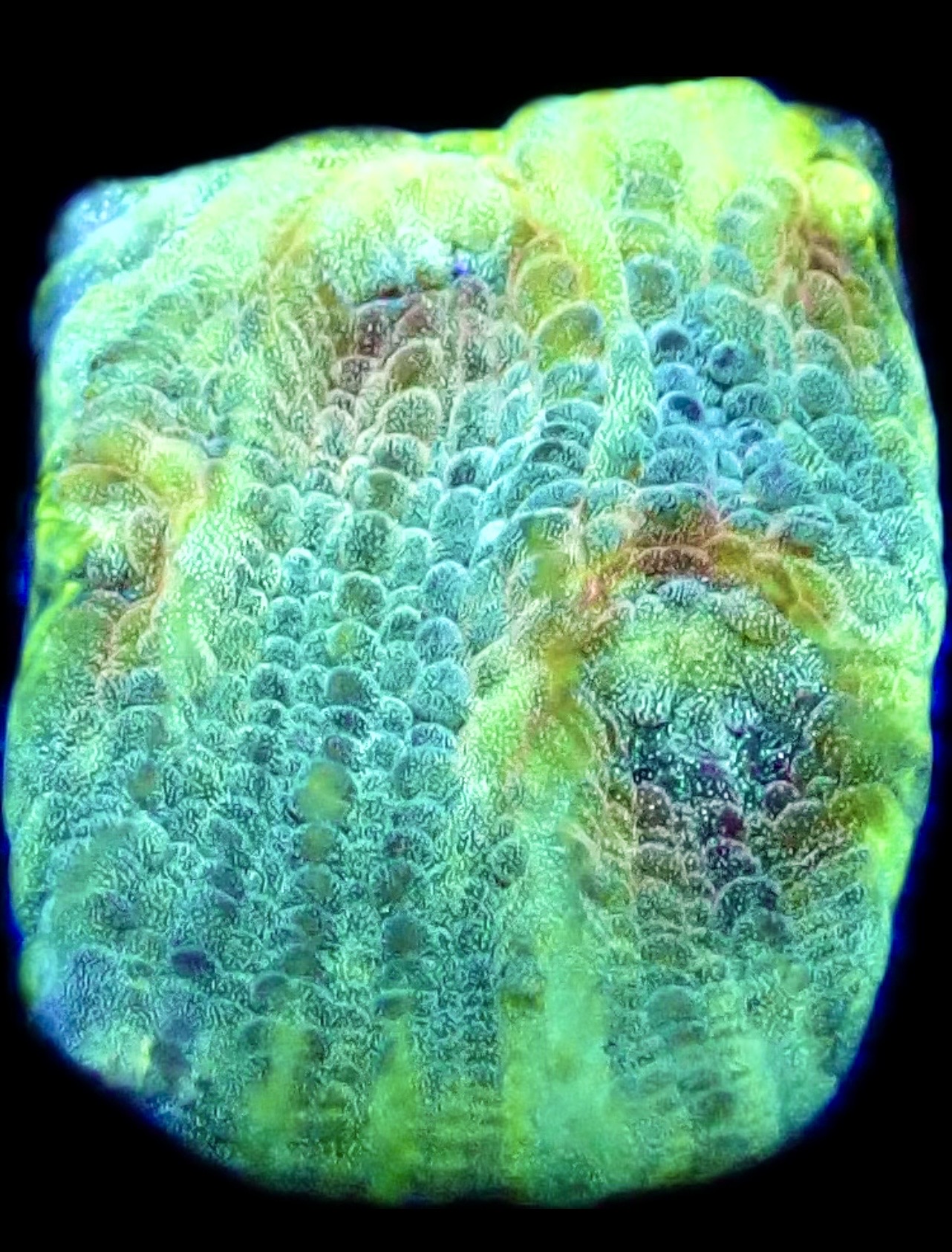 This very unusual frag of this stunning Chalice morph has settled extremely well, coloured up and healed superbly after being cut over 6 weeks ago from our mother colony and fully UK grown. The colours are really coming to the fore with the yellow eyes mixed with purples, reds, pinks and bright fluorescent green. Chalice really are stunning corals and this morph is a must for anyone wanting to add some great colour and patterns. Easy to look after and happy in low to medium par so a great addition to colour up the bottom half of your reef.