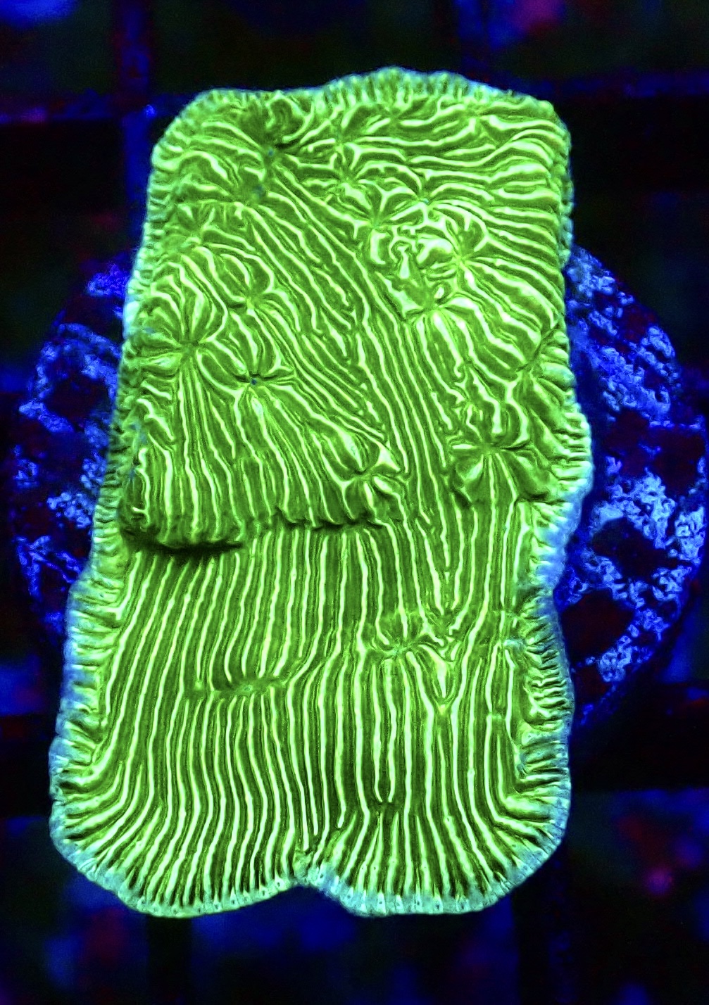 A very unusual addition to any SPS collection, very vibrant in colour and absolutely glows in the aquarium. Grows in a stunning plating / scrolling formation.