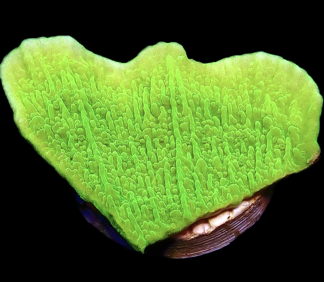 THESE ARE SUPER NEON GREEN MUCH BRIGHTER THAN THE STANDARD GREEN PLATING MONTIPORA