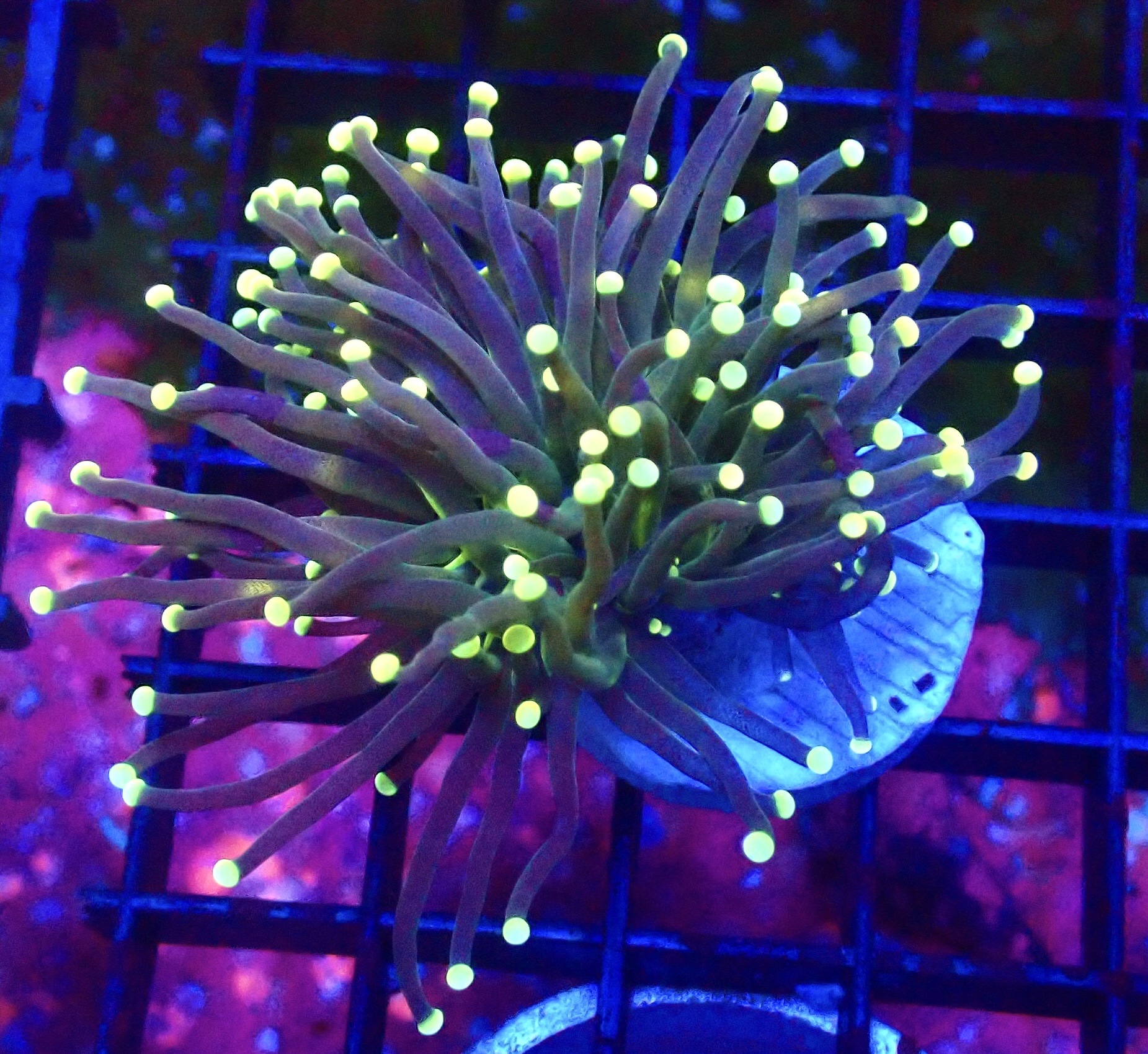 A stunning metallic green with beautiful yellow tips, this Euphyllia glabrescens torch coral has absolutely beautiful fluorescent coloured polyps.